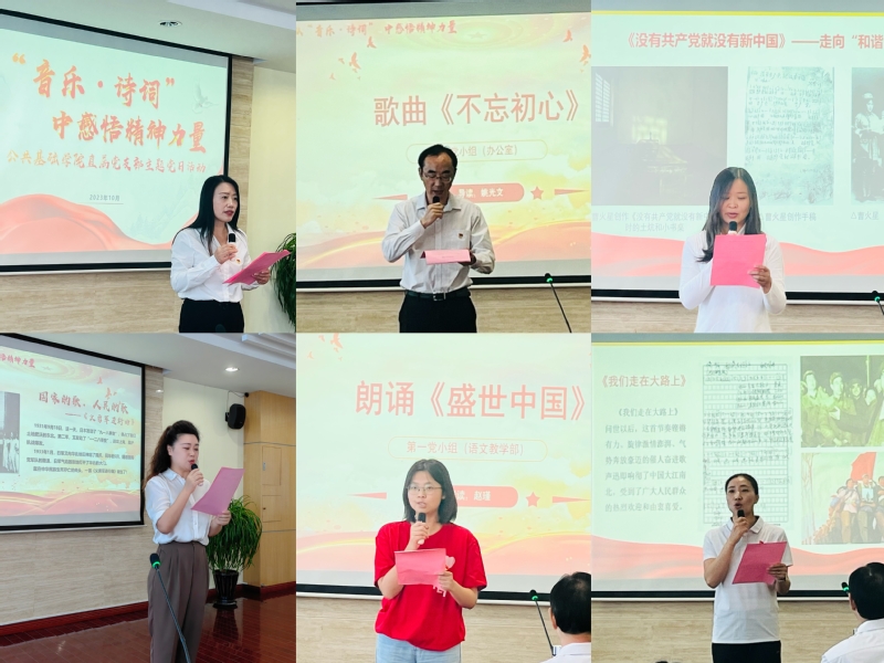 此次主题党日活动以镌刻着时代标记的歌曲和诗词朗诵为主线,在每首作品演绎前,党员老师运用音视频、图文和现场互动等多种形式对耳熟能详的经典音乐作品进行了详细导读,让老师们深入了解了作品背后荡气回肠的党史故事,在音乐旋律中重温党史、感受初心,在诗词中传递能量、锤炼党性,在欣赏中坚定信念、强化使命。通过主题党日活动的开展,进一步激发了党员教师的党性意识和宗旨意识,增强了党支部的凝聚力和战斗力,为学校内涵建设贡献力量。(供稿单位:公共基础学院直属党支部)