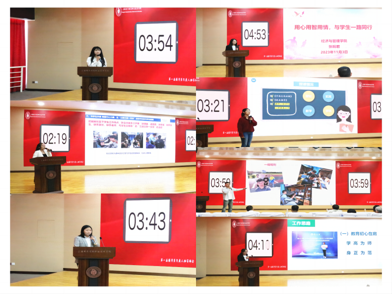 经前期个人申报、二级学院推荐、学工部复核,共有7位辅导员现场参评。根据答辩要求,每位辅导员展示时间总长8分钟,其中事迹陈述限时5分钟,评委提问作答时间限时3分钟。评委结合选手的事迹陈述和作答情况进行现场打分。7位选手结合工作思考,通过一个个感人至深的案例,体现围绕学生、关照学生、服务学生的工作理念,充分展示各自的工作特色和亮点。