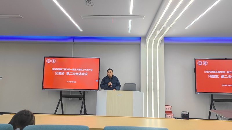 在第二次全体代表会议上,胡国胜向教职工代表作《通信学院2023年行政工作报告》和《通信学院年终绩效分配方案》两个文件的补充说明。