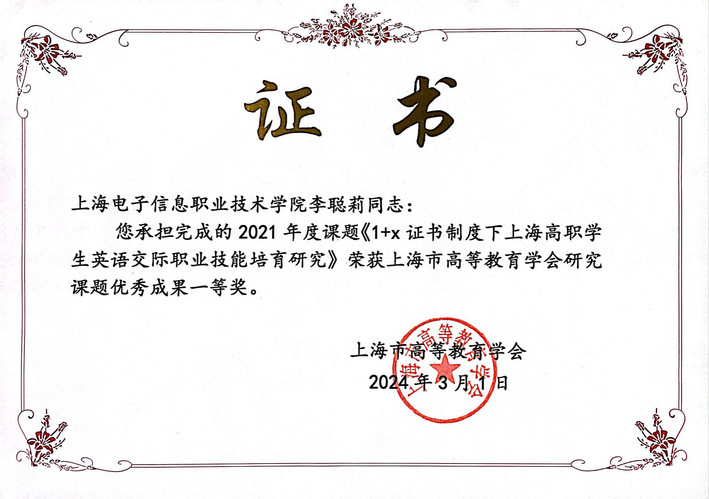 3月16日,上海市高等教育学会2024年学术年会在同济大学隆重召开。纽约国际官网外语学院教师李聪莉承担完成的2021年度课题《1+x证书制度下上海高职学生英语交际职业技能培育研究》荣获上海市高等教育学会研究课题优秀成果一等奖。