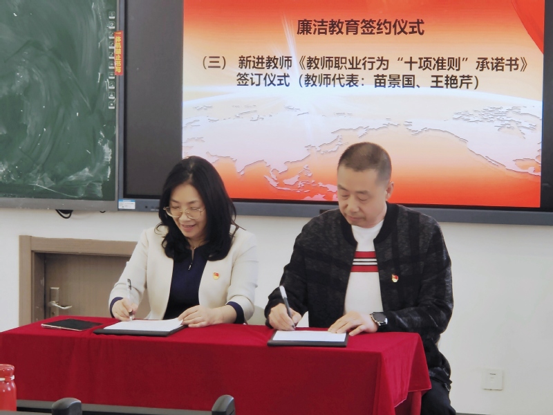 新进教师苗景国、王艳芹作为教师代表签署《教师职业行为“十项准则”承诺书》。