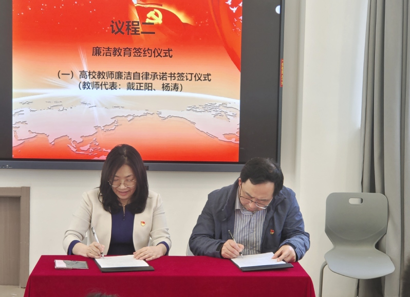 廉洁教育签约仪式上,戴正阳、杨涛作为教师代表上台签署《高校教师廉洁自律承诺书》。