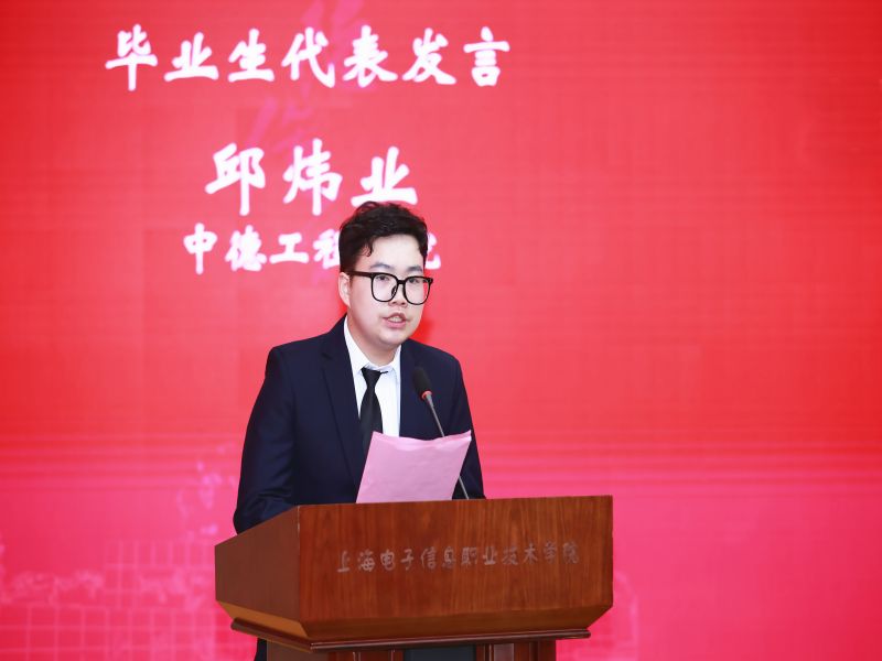 中德工程学院邱炜业作为毕业生代表发言。他回忆难忘的大学时光,畅谈求学的感悟体会,表达了对母校的深深热爱、感激与不舍。他表示,要将母校的精神传承下去,将老师们的教诲铭记在心,将同学们的情谊化作前进的动力。