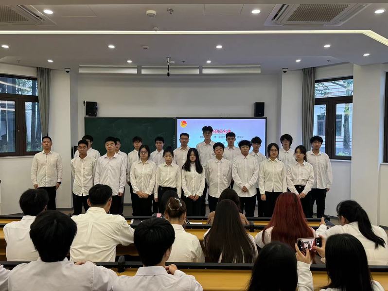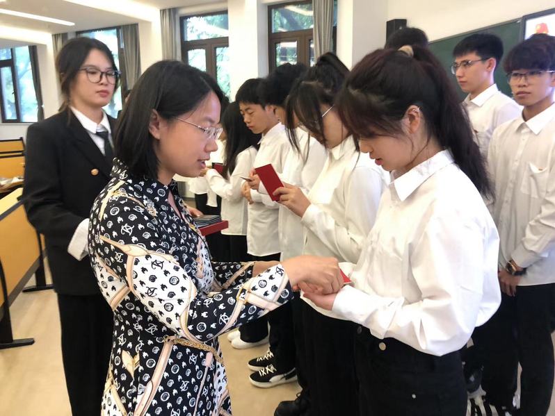 吴莉洁和张裕为新团员佩戴团徽,颁发团章、团员证。随后,张振威同学带领全体团员进行入团宣誓,新团员们的语气满是坚定、誓言饱含热情。新团员代表崔程焜和优秀团员代表杨延韬在发言中表示在团组织的指导下,将继续努力学习、突破自我,争做有理想、敢担当、能吃苦、肯奋斗的新时代好青年。