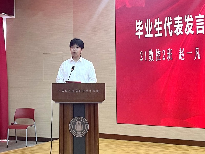 赵一凡同学代表全体2024届毕业生发言。他谈到,在学校的栽培下,不仅学到了扎实的专业知识与技能,更重要的是学会了独立思考,懂得了责任和担当,学会了团结协作,明白了人生价值与追求,也更加坚定了理想信念。