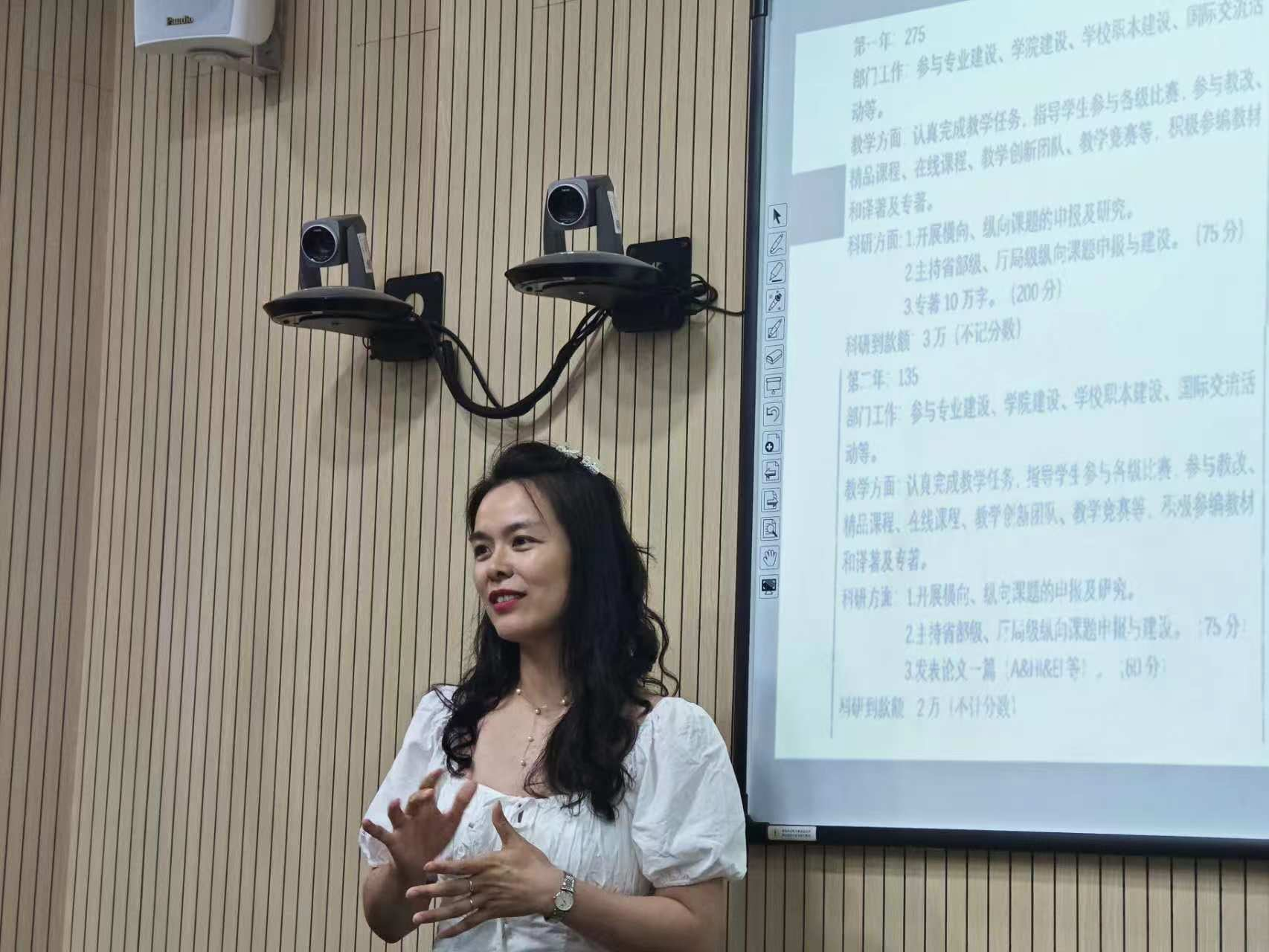 李聪莉老师就本年度即将验收项目情况和成果经验做了汇报。王华博士等2022年引进高层次人才就项目执行过程、工作感悟进行交流,并就高层次人才激励任务、科研启动任务等各项重点工作指标分配做了经验分享,对后续探索“外语+”、外语产学研项目作了工作计划与部署。