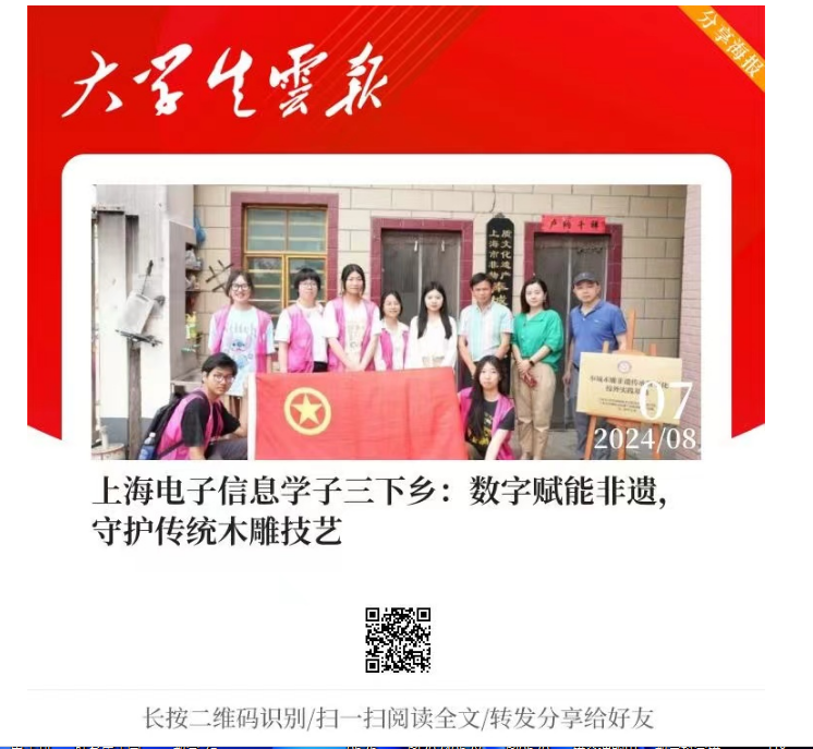 活动期间,实践团队积极向《大学生云报》等媒体投稿,分享了活动成果与感悟,以“上海电子信息学子三下乡:数字赋能非遗,守护传统木雕技艺”为题,广泛传播了团队在非遗保护与传承方面的努力与成就,进一步提升了社会对传统木雕艺术的关注与认可。