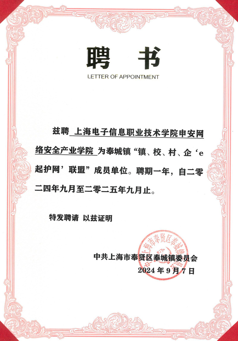 网络安全是数字化、信息化的基本保障。在网安周活动现场,奉城镇党委副书记龚健为积极维护网络安全的村镇、高校、企业颁发“镇、校、村、企‘e起护网’联盟”聘书,我院何永艳老师作为代表上台领取聘书。未来,申安网络安全产业学院将在城市数字化转型过程中为奉贤网络安全保障做出更大的贡献。(供稿:申安学院)
