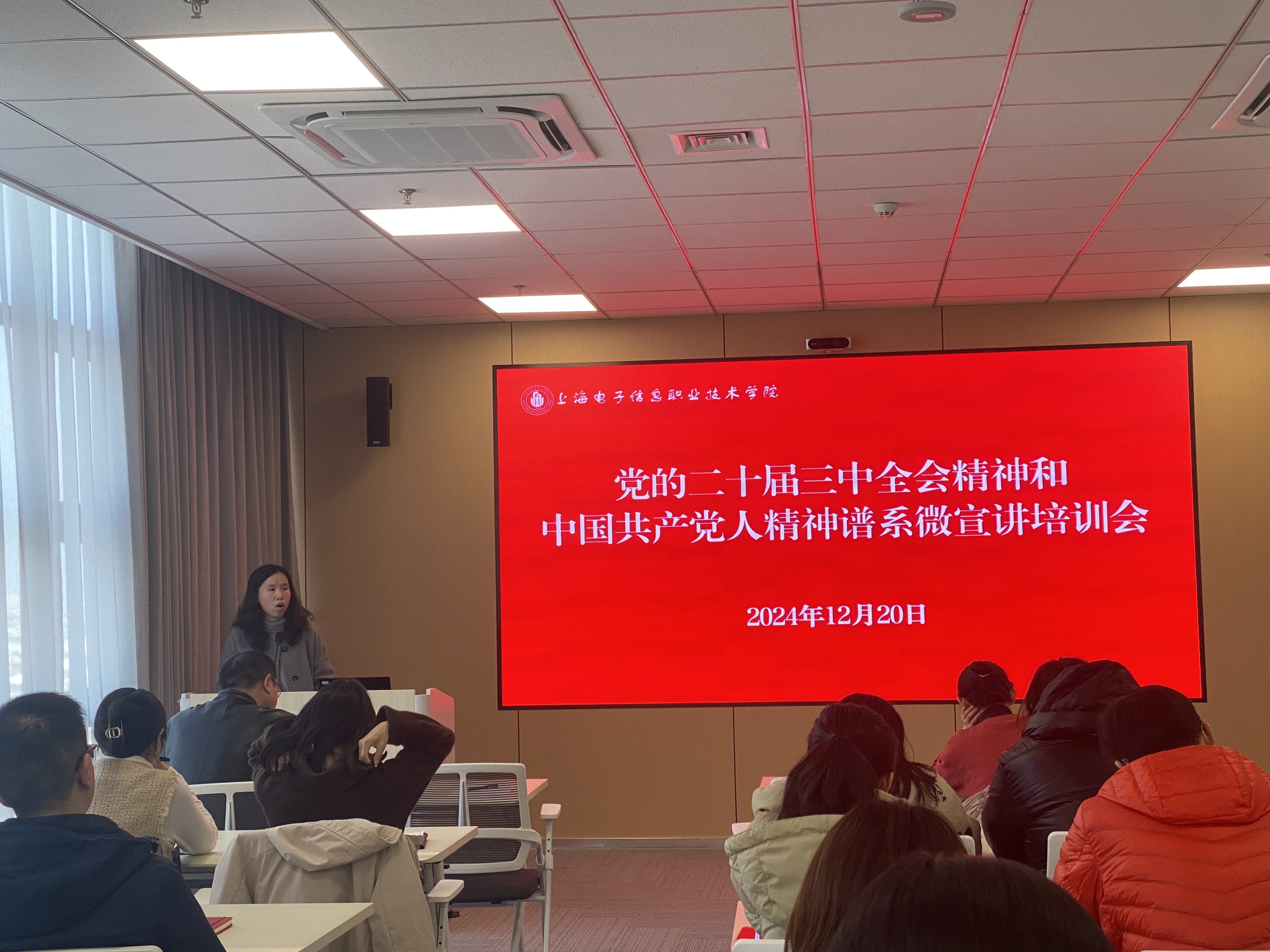 12月20日,党的二十届三中全会精神和中国共产党人精神谱系微宣讲培训会在新实训大楼1012室举办。会议邀请到马克思主义学院专任教师王茜做赛前培训,各二级党组织参赛老师共30余人参加。会议由党委宣传部副部长陈卫炉主持。