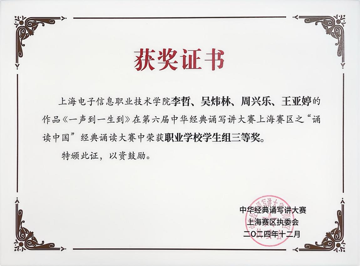 李哲、吴炜林、周兴乐、王亚婷四位同学的诵读作品《一声到一生到》(指导教师:刘园园)获职业学校学生组三等奖。