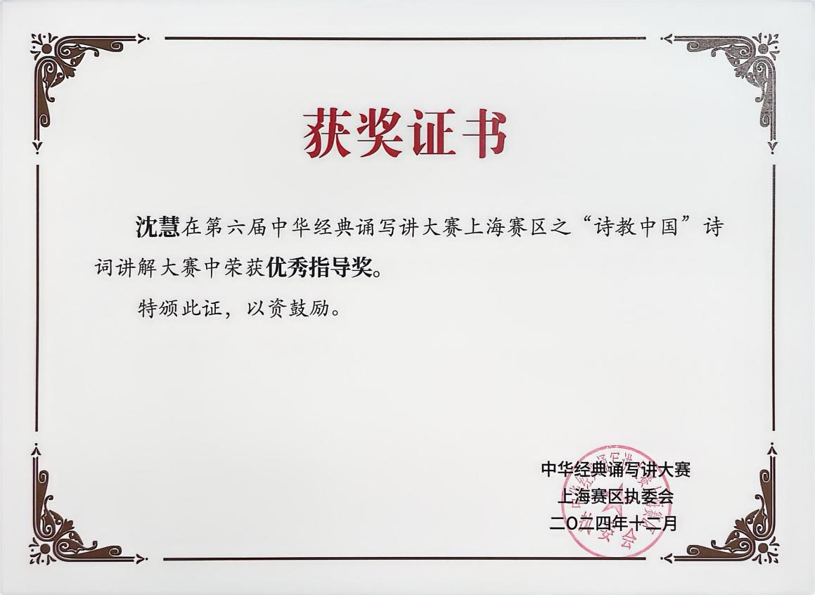 沈慧老师在“诗教中国”诗词讲解大赛中获优秀指导奖。