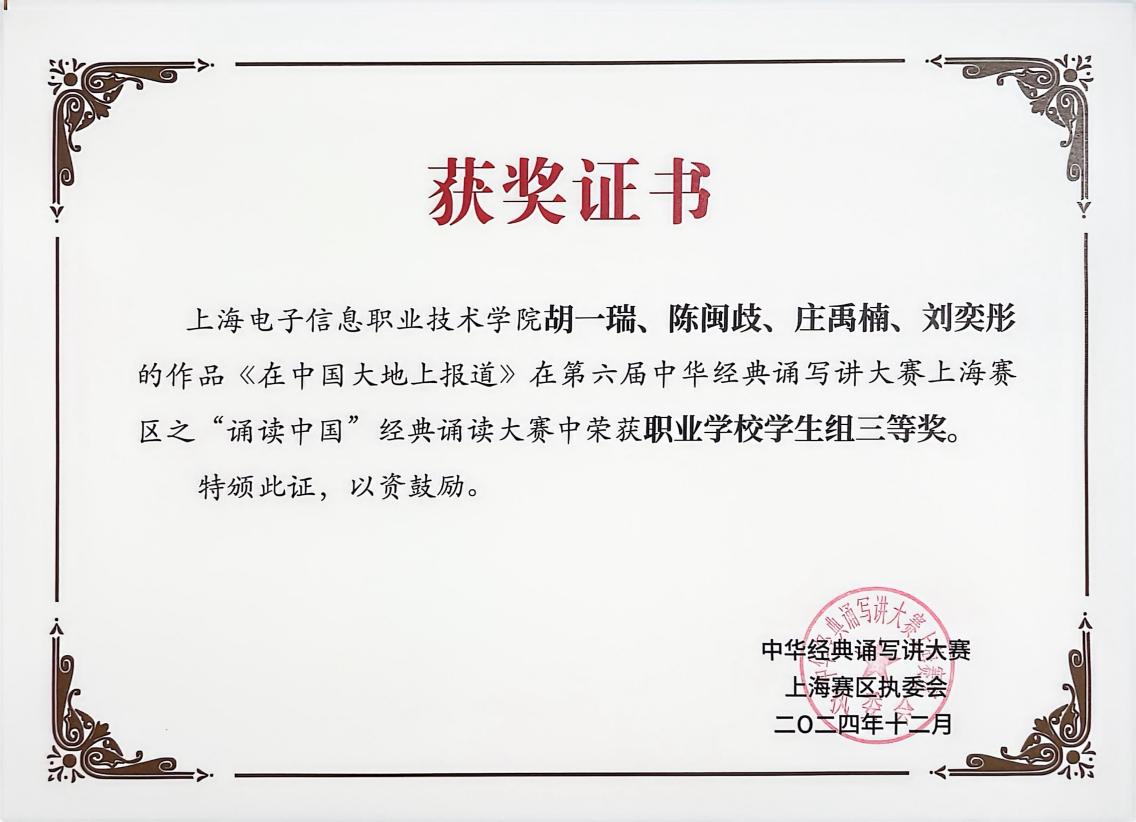 胡一瑞、陈闽歧、庄禹楠、刘奕彤四位同学的诵读作品《在中国的大地上报道》(指导教师:鲍昱含、封雪)获职业学校学生组三等奖。