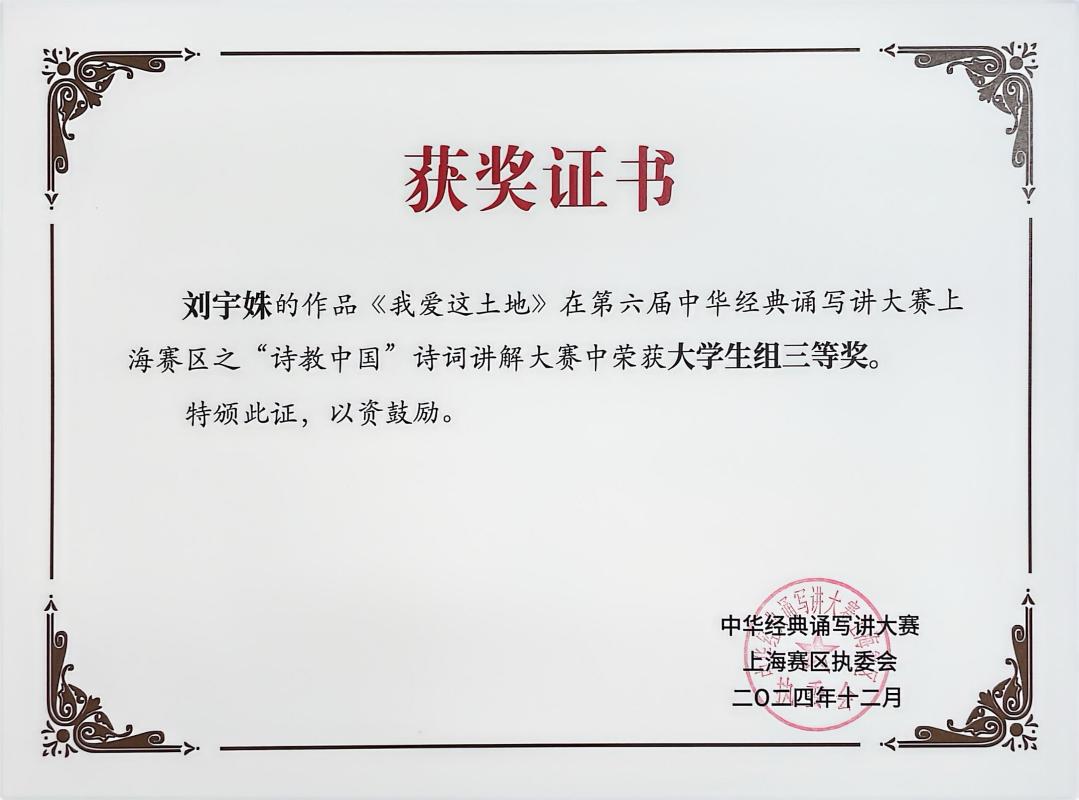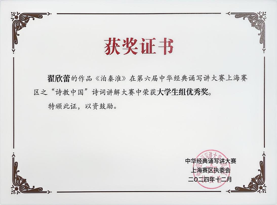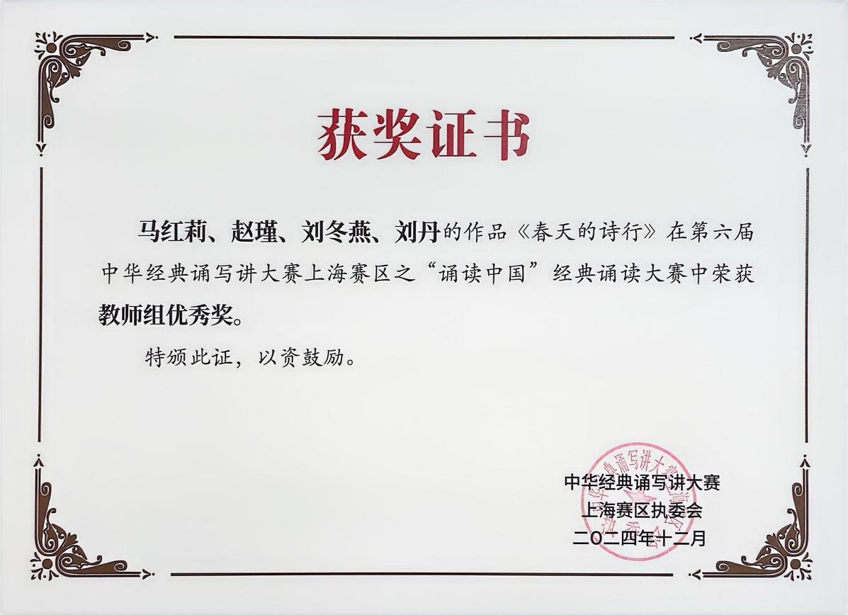 前期经过校内初赛、复赛、决赛层层选拨和专家指导及拍摄录制后,校语委办共推荐12组作品到第六届中华经典诵写讲大赛(上海赛区)组委会进行市级集中评审,最终有10组作品在第六届中华经典诵写讲大赛上海赛区中获奖,其中一等奖1项、三等奖4项、优秀奖5项,1位教师获得优秀指导教师奖。