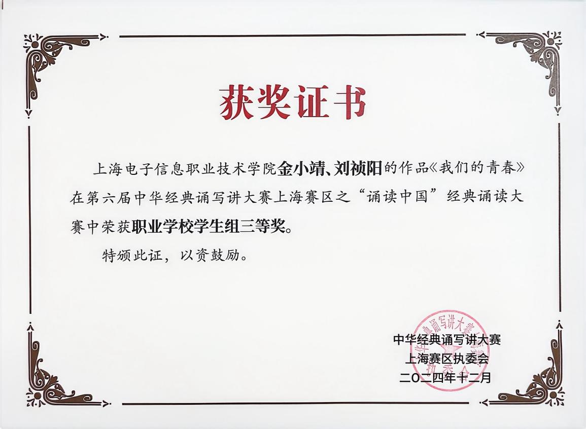 金小靖、刘祯阳同学的诵读作品《我们的青春》(指导教师:杨洋、赵繁)获职业学校学生组三等奖。