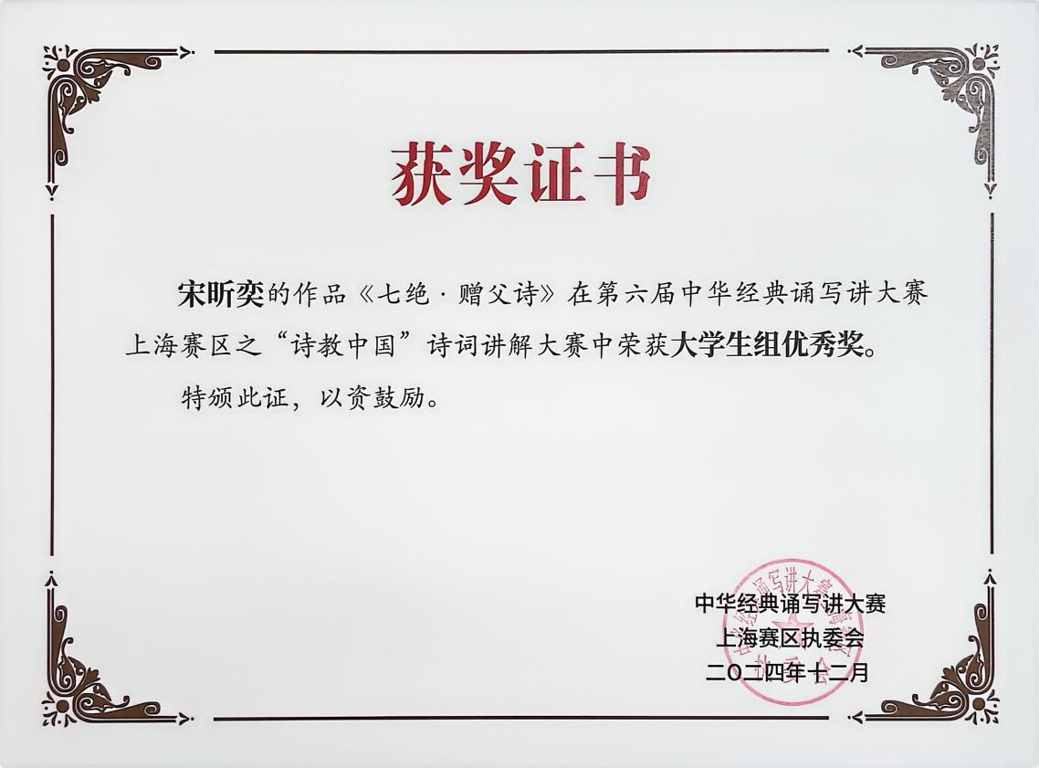 宋昕奕同学讲解作品《七绝·赠父诗》(指导教师:神慧)获大学生组优秀奖。