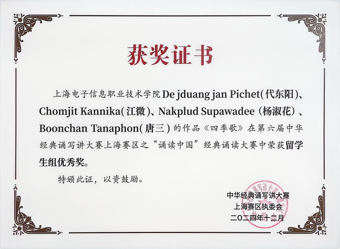 Boonchan Tanaphon(唐三)、Chomjit Kannika (江微)、Dejduangjan Pichet (代东阳)、Nakplud Supawadee(杨淑花)四位泰国学生的诵读作品《四季歌》(指导教师:赵瑾)获留学生组优秀奖。