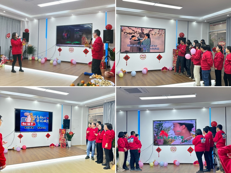 教职工互动交流、歌唱、舞蹈、游戏等穿插进行,歌声、笑声、欢声回荡在会场之上。