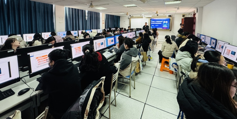 本次培训邀请人工智能研究院博士团队进行授课,培训内容涵盖了人工智能核心原理科普及AIGC赋能教学科研,包括其在古诗词、英语、数学、物理、历史等多学科教学中智能体的建构。即使天气寒冷,也挡不住学员求知的向往与热情,机房内座无虚席,学习气氛浓厚。