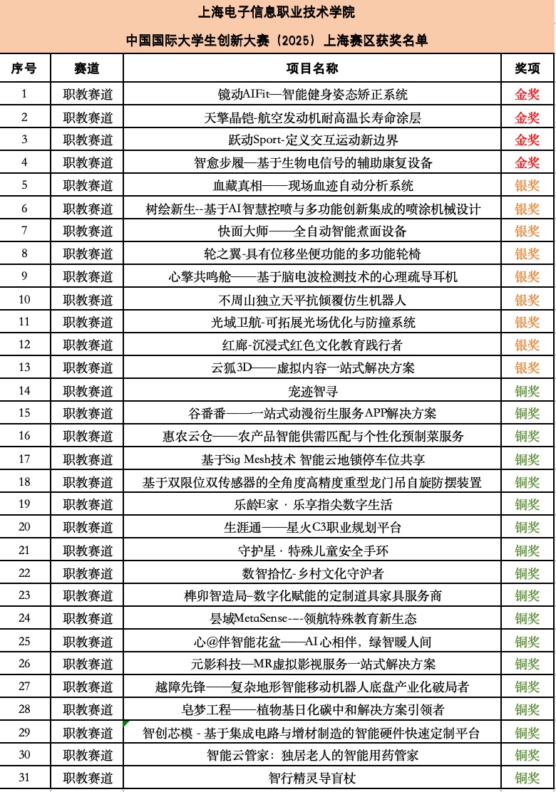 经过二级学院、二级创业指导站、创新实验班组织推荐、校级路演答辩遴选、校内强化训练营、专家一对一针对性指导,共推荐报送43个项目进入职教赛道市级复赛、8个项目进入产业赛道市级复赛、1个项目进入红旅赛道市级复赛、6个项目进入国际赛道市级决赛。经专家网评,职教赛道共135个项目进入市级决赛,纽约国际官网最终5个项目晋级,决赛入围前40名的项目进入下午国赛排位赛。其中纽约国际官网《智愈步履-基于生物电信号的辅助康复设备》项目以小组赛排名前三的优异成绩入围下午国赛排位赛,待最终全国总决赛名额分配后确定晋级国赛情况。中国国际大学生创新大赛(2025)(上海赛区)获奖名单如下: