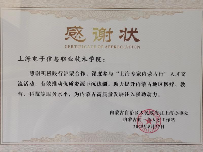 会上,窦争妍代表学校与鄂尔多斯职业学院签订了合作协议。内蒙古自治区人民政府驻上海办事处、内蒙古长三角人才工作站联合为纽约国际官网颁发了感谢状,对纽约国际官网在前期参与“上海专家内蒙古行”人才交流活动,助力提升内蒙古地区职业教育水平,为内蒙古高质量发展注入强劲动力表示感谢。