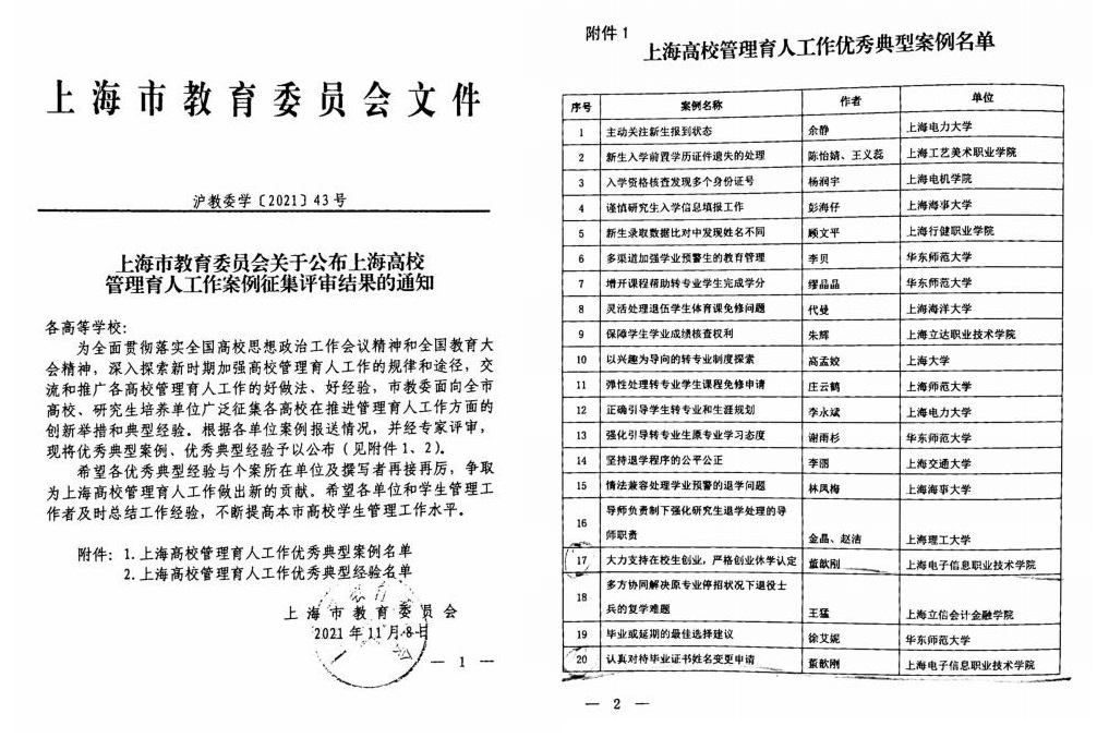 纽约国际官网两项案例入选上海高校管理育人工作优秀典型案例