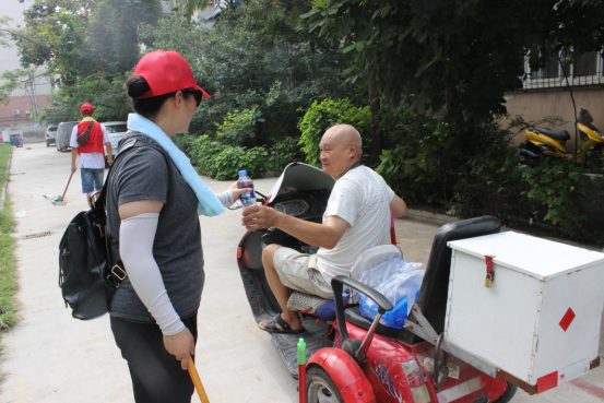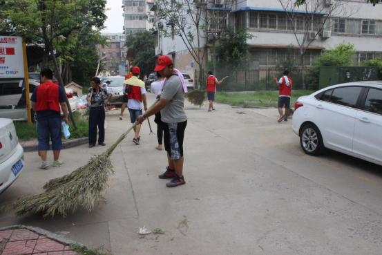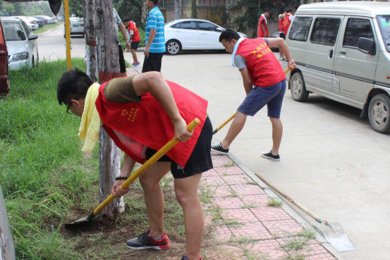 在了解到金穗社区的在7月9号受灾情况后,志愿者们便开始积极投入到志愿服务:担负打扫整个社区街道卫生与垃圾杂物的清理工作。虽然是大暑天气,但是志愿者们不顾天气的闷热,不怕脏、不怕累,哪里最脏乱,最难清理,党员老师冲在清理的第一线,先打扫哪里,起到了中共党员的模范带头作用。在党员老师的队伍里,赵金坤老师已经是怀孕四个月了,听说了有灾后重建的志愿者服务,毅然报名参加到志愿服务中来,不顾身体的不便,和大家一起加入灾后的清理工作中来。在老师的示范下,学生志愿者们一个个也摩拳擦掌,拿着工具投入到了清理工作中去。经过志愿者的清理后,虽然大家一个个汗流浃背,但是社区里的垃圾不见了、杂草也一扫而光,让社区的面貌焕然一新。社区里的大爷给志愿者们送来了水和毛巾,大妈也在一边称赞到“现在的大学生就是好样的。”