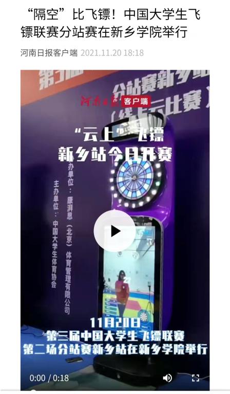 11月20日,由中国大学生体育协会主办,康湃思(北京)体育管理有限公司协办,beat365承办的第三届中国大学生飞镖联赛(新乡站)在beat365综合运动馆开幕。副校长、体育委员会主任王选年,宣传部部长苏辉、团委书记周宁、工会副主席魏祖志、教务处处长高雪霞、beat365英国官方网站党总支书记张启中出席开幕式。