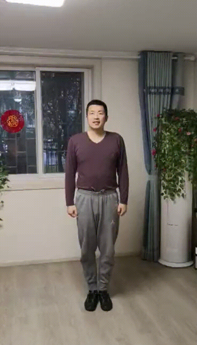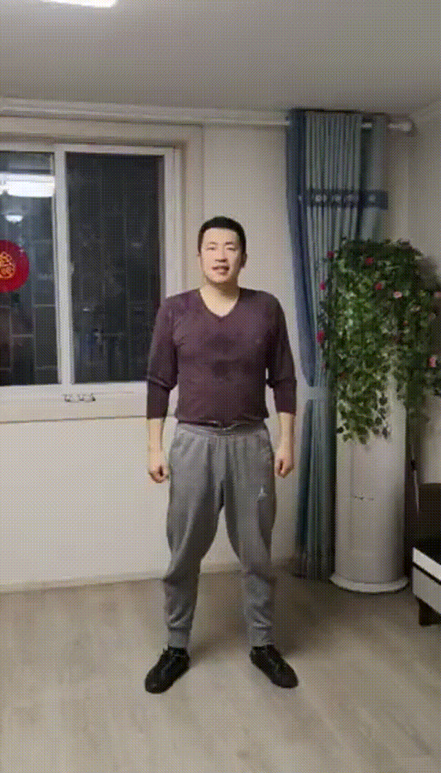 双脚开合跳跃,小腿尽可能放松,不可低头、仰头。