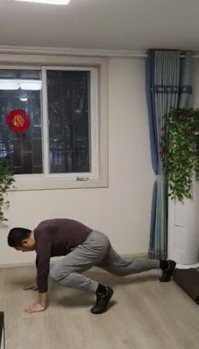 左右交替跳跃提膝的同时双手在大腿下侧击掌。