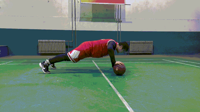动作要领:收紧腰腹部,然后屈肘让重心下降至贴近地面的位置,再集中胸肌的力量快速推起后,将篮球换手,继续重复进行