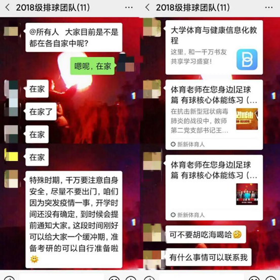为了居家期间,师生群众身体素质不下降, 2019级创新引飞导师张美玲老师会向学生进行专业性的介绍,在家如何运动,运动相结合。出门在外一定要带好口罩,要避免人群多的地方。张老师建议学生每天可以户外跑一跑步,积极锻炼一下身体,保持好身体素质。虽然现在不能开学,但身为体育生身体素质一定要保持好。 同时张老师一边传达疫情相关知识与防控手段,一边叮嘱同学们服从学校与政府安排,时刻与学生保持联系,关心关爱学生,为学生的安全和下阶段学生安全返校打下了坚实的基础!
