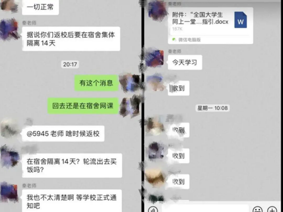 在疫情防控期间,2018级创新引飞导师焦苗苗老师利用微信群积极传播“正能量”, 每天统计学生所在地,做到工作细致有序、落在实处。同时焦老师加强学生的思想政治教育,引导学生更好地继承和发扬爱国主义精神,增强责任意识和大局意识。 虽然在疫情期间无法现场指导教学,但焦苗苗老师并未因此停止学生每周一次的组会活动。焦老师每周组织视频会议,学生汇报近期身体状况、学习情况及下周学习计划,根据每个人不同的情况调整学习计划安排。同时,焦苗苗老师为学生生送去假期“大礼包”及时进行检查监督,积极关心学生现状,传达疫情信息,做好情绪疏导,指导综合学习,倡导学生健康作息、科学防护、加强学习。