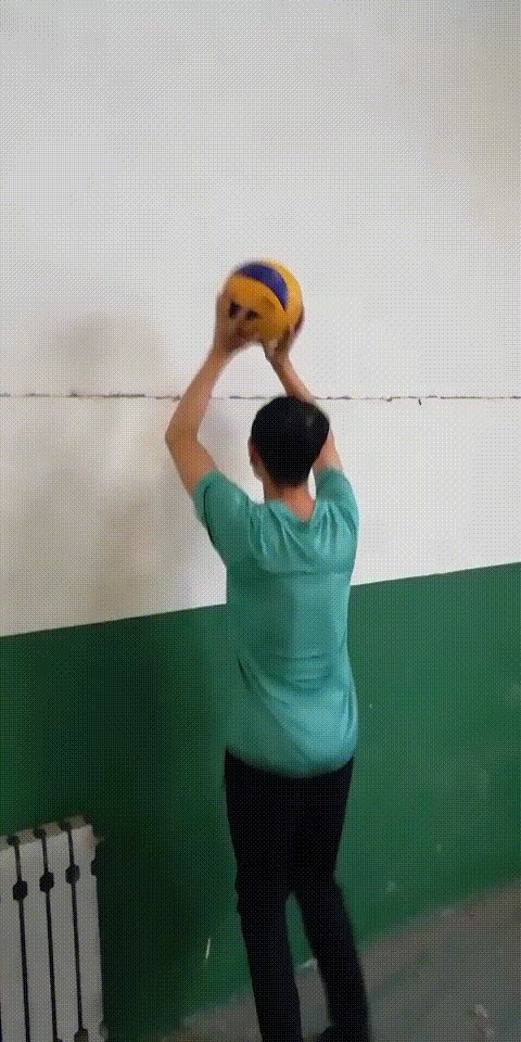 拦网模拟练习动作要领:面对墙壁,双手于球两侧偏后的位置握住球,连续起跳并使球触碰墙壁。注意球不得脱手。