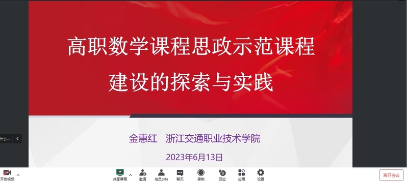 2023年6月13日,浙江交通职业技术学院数学教研室主任金惠红教授受邀为公共基础学院教师作课程思政线上专题培训。学院全体教师参加培训。培训会由公共基础学院姚光文院长主持。 金惠红教授以“高职数...