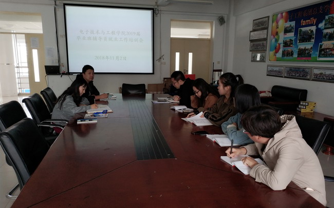 11月2日中午,电子技术与工程学院在实训楼N307召开2019届毕业班就业工作培训会,全体学生工作团队参加。本次培训特邀校企合作处顾豪杰老师做就业工作专题指导。 会上,顾豪杰老师为大家宣讲了就业政策,强...