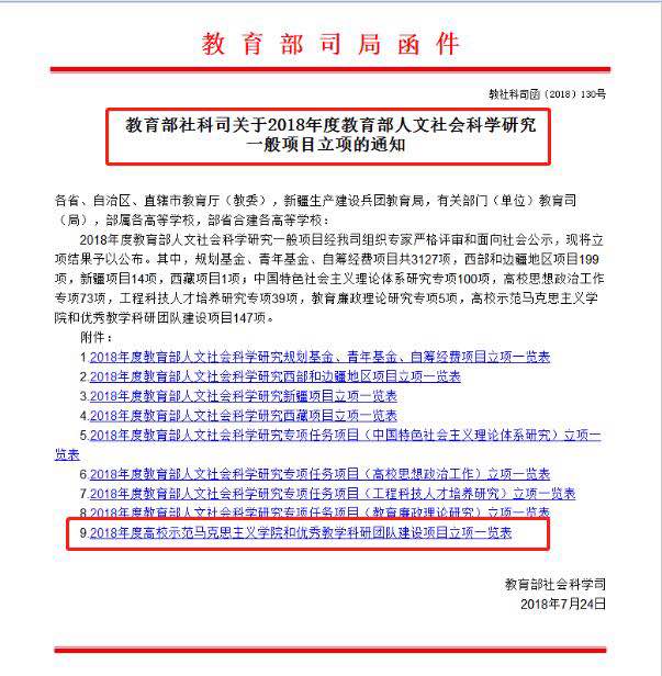 2018年7月底,教育部社科司公布了2018年度教育部人文社会科学研究一般项目的立项通知,纽约国际官网马克思主义学院茌良计老师主持申报的项目《高职高专“毛泽东思想和中国特色社会主义理论...