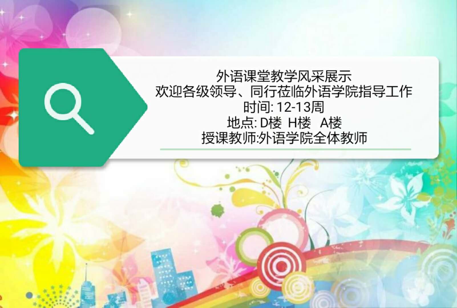 为全面贯彻党和国家的教育方针和政策,积极落实学校教育教学检查和督导工作,搭建外语教师锻炼、展示、交流学习的平台,提升外语教师的专业发展和教育教学质量,外语学院于12周-13周举办了外语课堂教学风采展示...